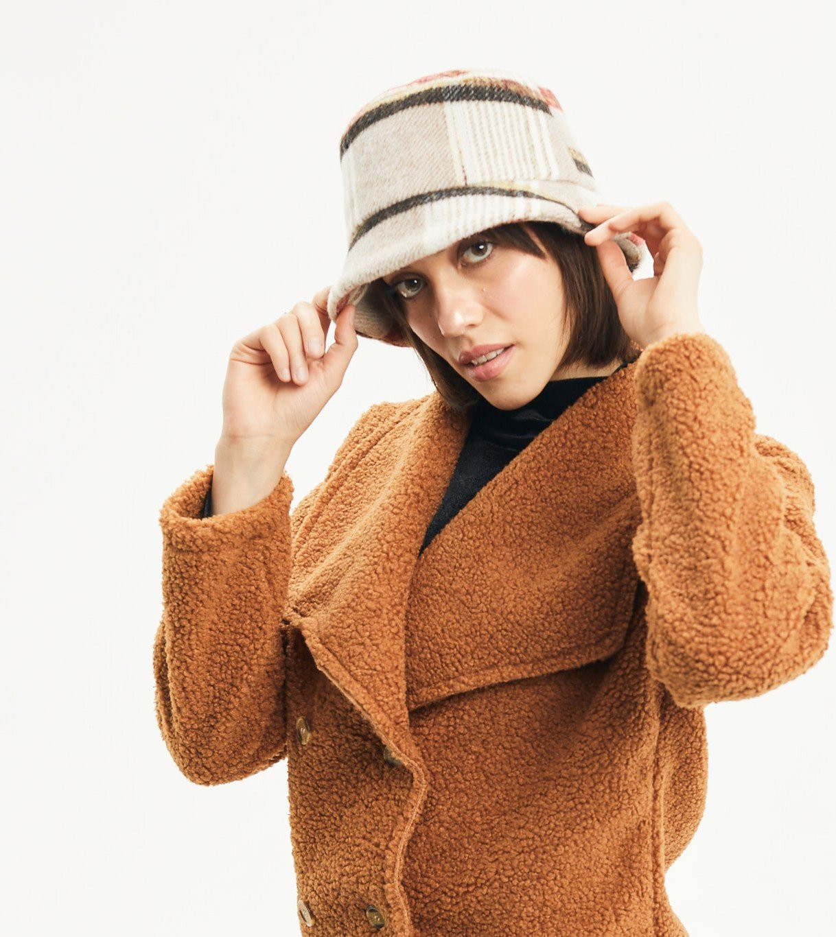Der TONIA Bucket Hat ist ein femininer Hut mit Karomuster aus gebürstetem Stoff. Weich, geschmeidig und trendig verleiht er Ihren Herbstoutfits einen Retro-Touch.