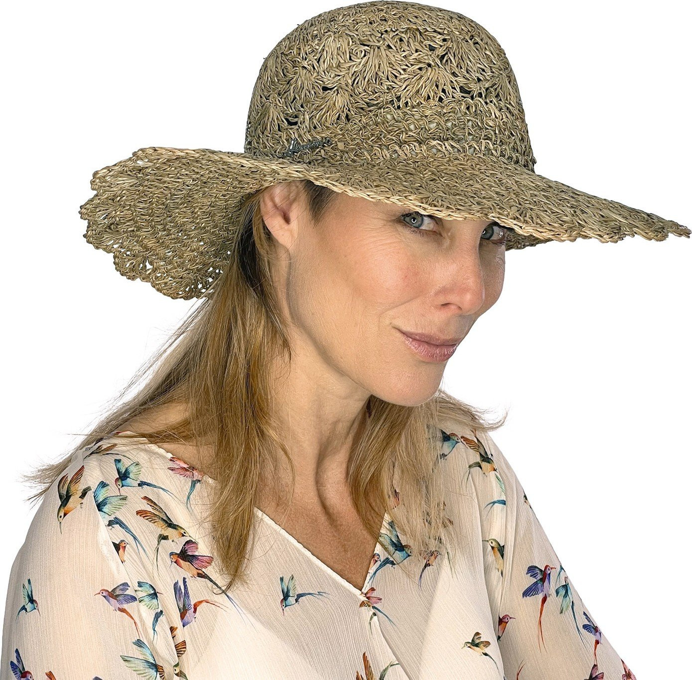 Der ROSIE Hut mit breiter Krempe aus Seegras ist mit einer dekorativen Blume aus Stroh verziert. Seine breite Krempe bietet effektiven Sonnenschutz und verleiht ihm gleichzeitig eine feminine Note. Ein natürlicher und charmanter Sommerhut.