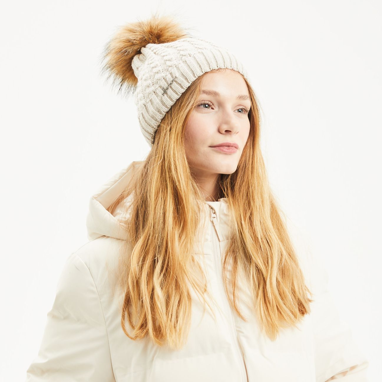 Die LOUISE Mütze ist eine Ode an Komfort und Wärme. Sie verbindet die zeitlose Ästhetik des **groben Zopfstricks (cable knit)** mit einer Komposition, die für große Kälte konzipiert wurde. In ihrem natürlichen Beige/Off-White-Ton erinnert sie an die Gemütlichkeit eines Kaminfeuers und die Cocooning-Atmosphäre langer Wintertage.