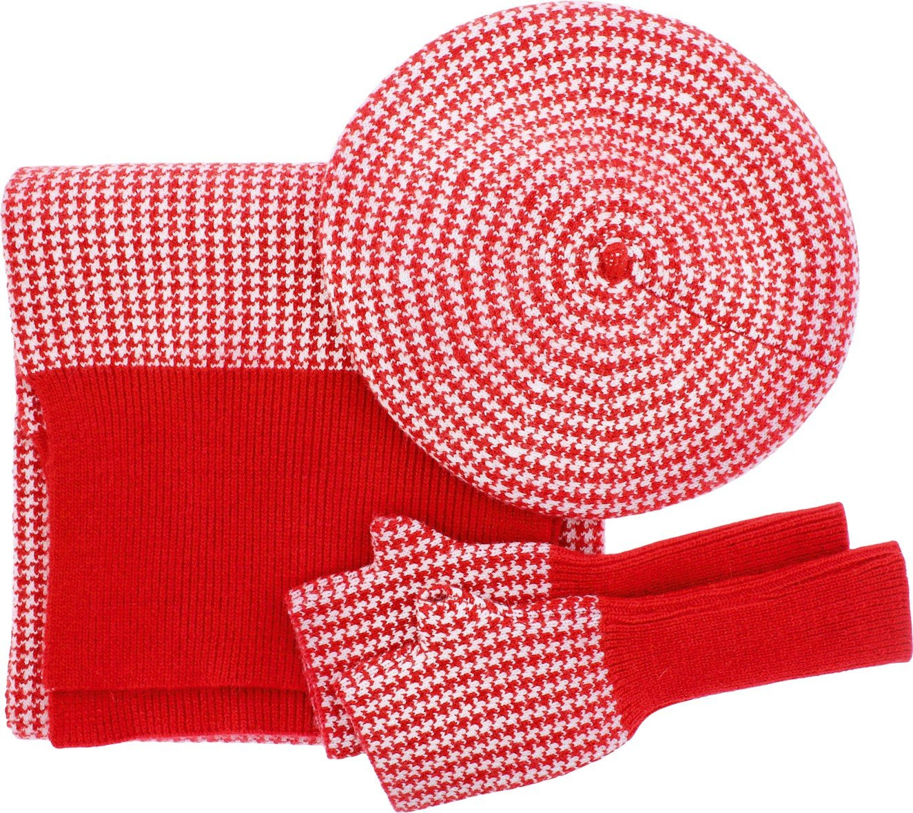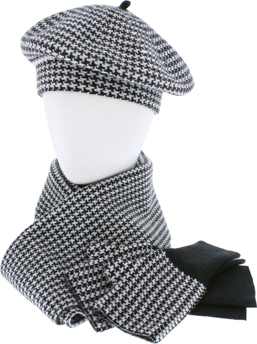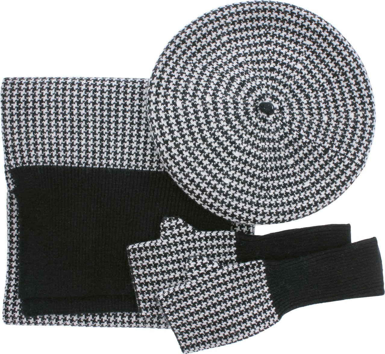 Hahnentrittmuster-Set, mit LUREX-Garn, bestehend aus einer Baskenmütze, langen Fäustlingen und einem Schal (170x30cm)