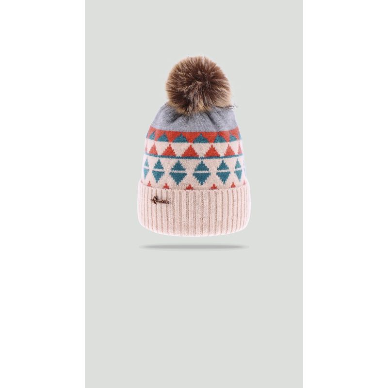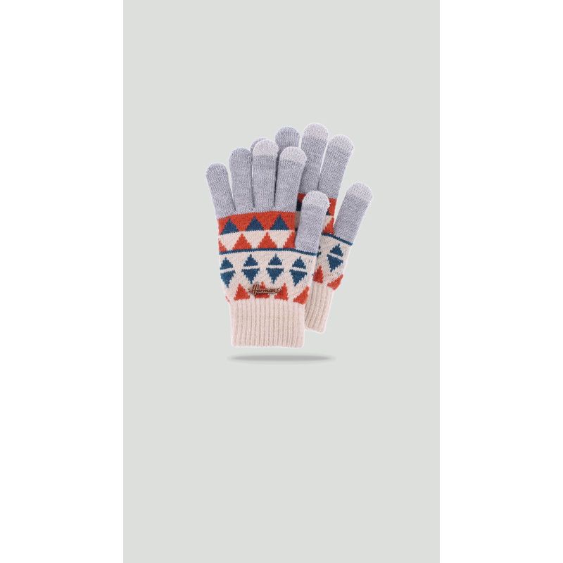 Set consisting of a pompom hat, a pair of touchscreen gloves and a scarf (180x26cm), triangle patterns