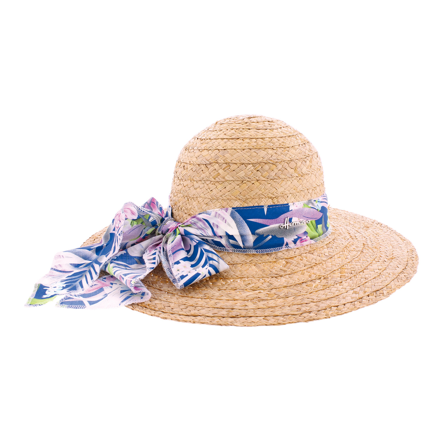 La capeline SECRET est conçue en paille raphia unie, ornée d’un foulard noué. Sa forme souple et son grand bord assurent une protection élégante contre le soleil.