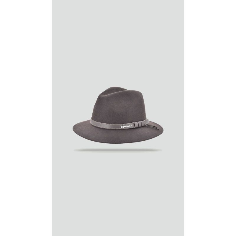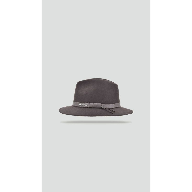 Chapeau à grand bord baissé en feutre de laine uni avec une ceinture en cuir.