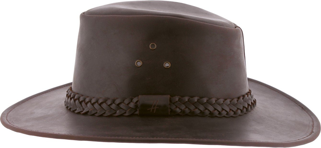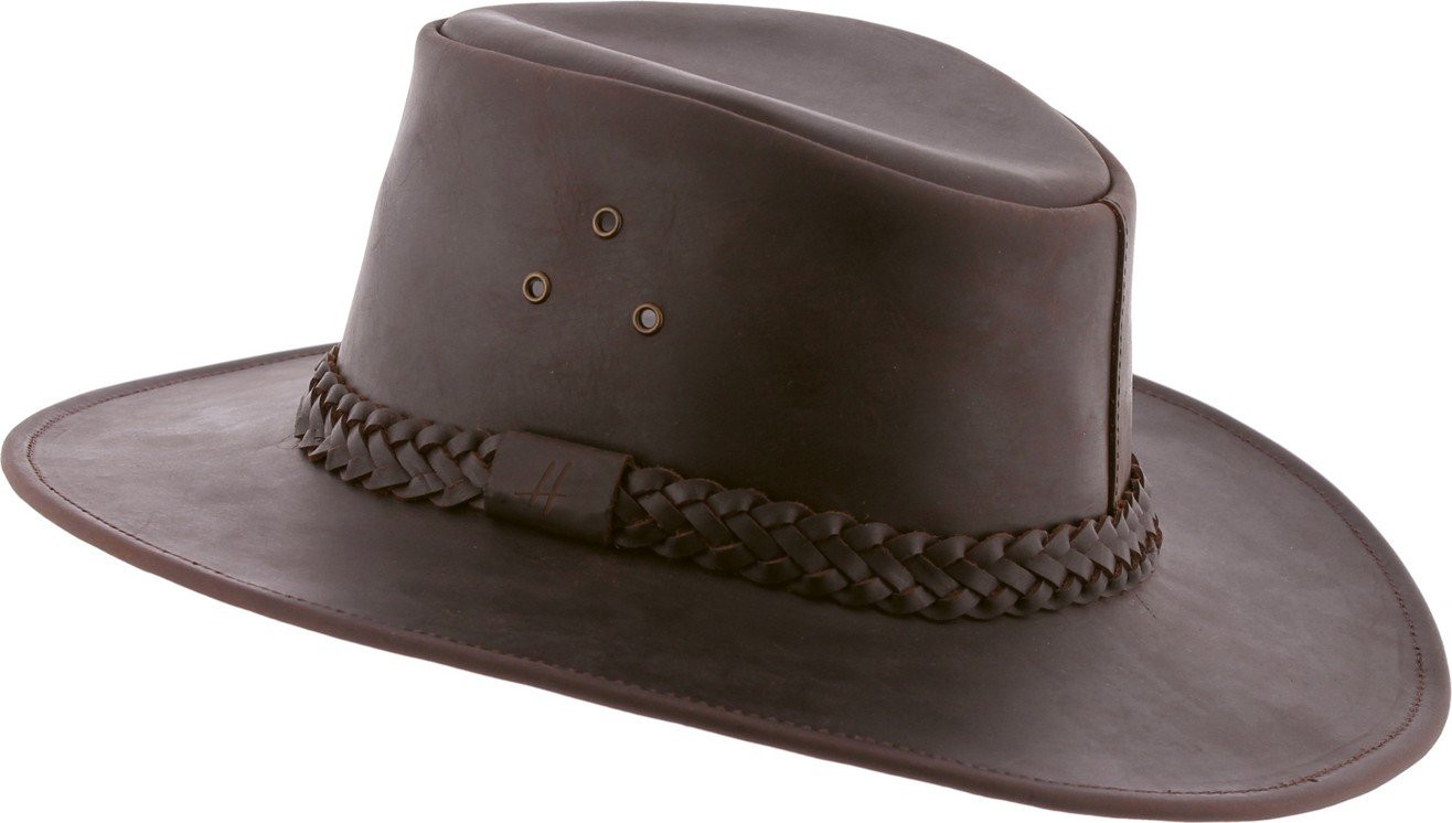 De AUSTRALIAN hoed valt op door zijn ontwerp van echt buffelleer, een edel en duurzaam materiaal. De metalen ogen en brede rand geven hem een authentieke en robuuste uitstraling.