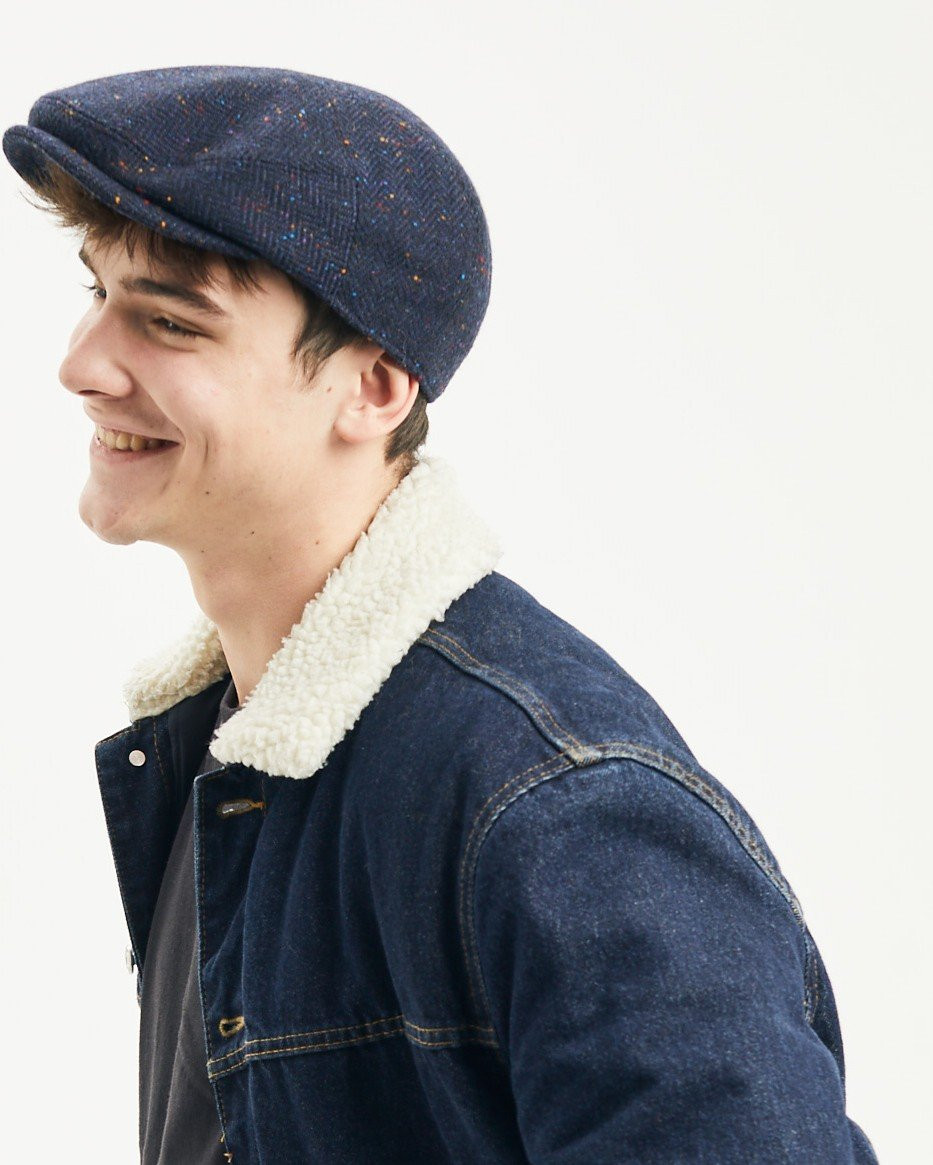 De ERNEST pet heeft een typisch tweed visgraatmotief, waarbij wol en polyester worden gecombineerd voor een gestructureerde en warme look.